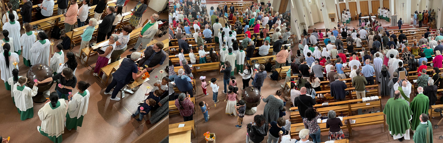 Heute feierten die drei internationalen Gemeinden und die verschiedenen Gruppen am Kleinen Michel ihr alljährliches Sommerfest. Das Gemeindeteam und Pater Görtz hatten sich in diesem Jahr etwas Besonderes dazu ausgedacht. Zu Beginn des gemeinsamen Gottesdienstes zogen ungefähr hundert große und kleine Menschen in einer langen Prozession in die Kirche ein und schmückten den Altar mit einer Blume, die im Eingangsbereich ausgeteilt wurde. So entstand nach und nach ein bunter „Blumenteppich“ als Sinnbild für die versammelte Vielfalt unter dem einen Dach dieser Kirche.