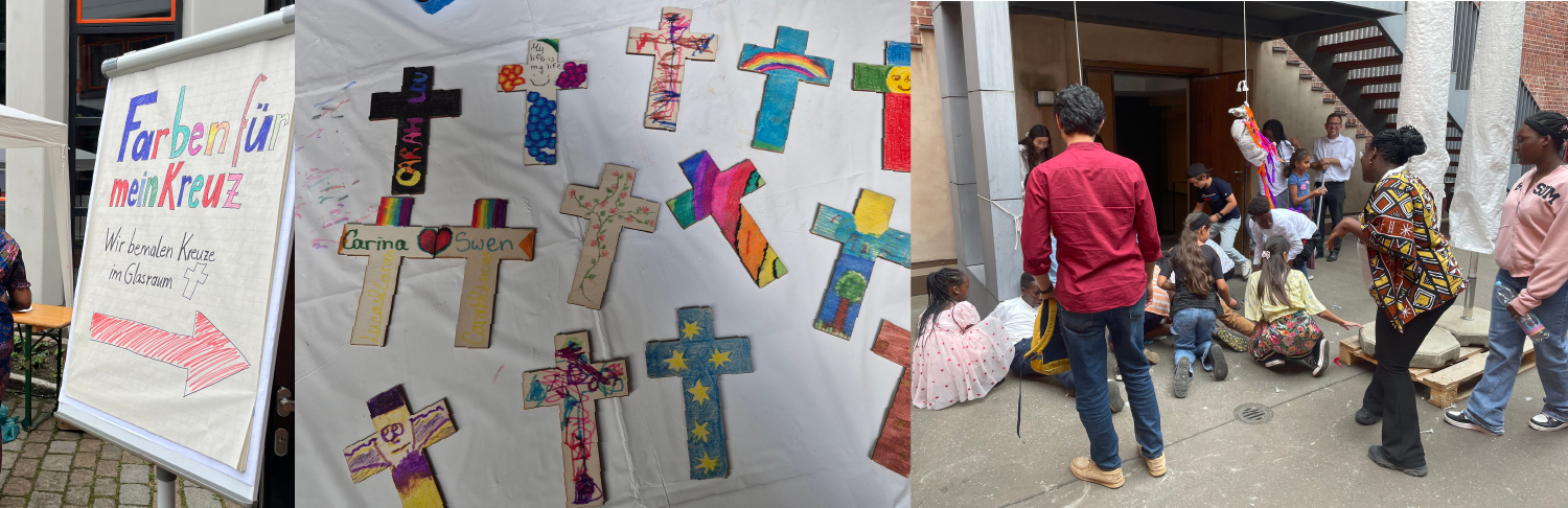 Nach der Messe gab es einen Mittagstisch mit Kulinarischem aus aller Welt und ein abwechslungsreiches Programm auf dem Platz vor der Kirche. Ausserdem ein Kreativ-Angebot für Kinder – es wurden kleine Kreuze gestaltet.